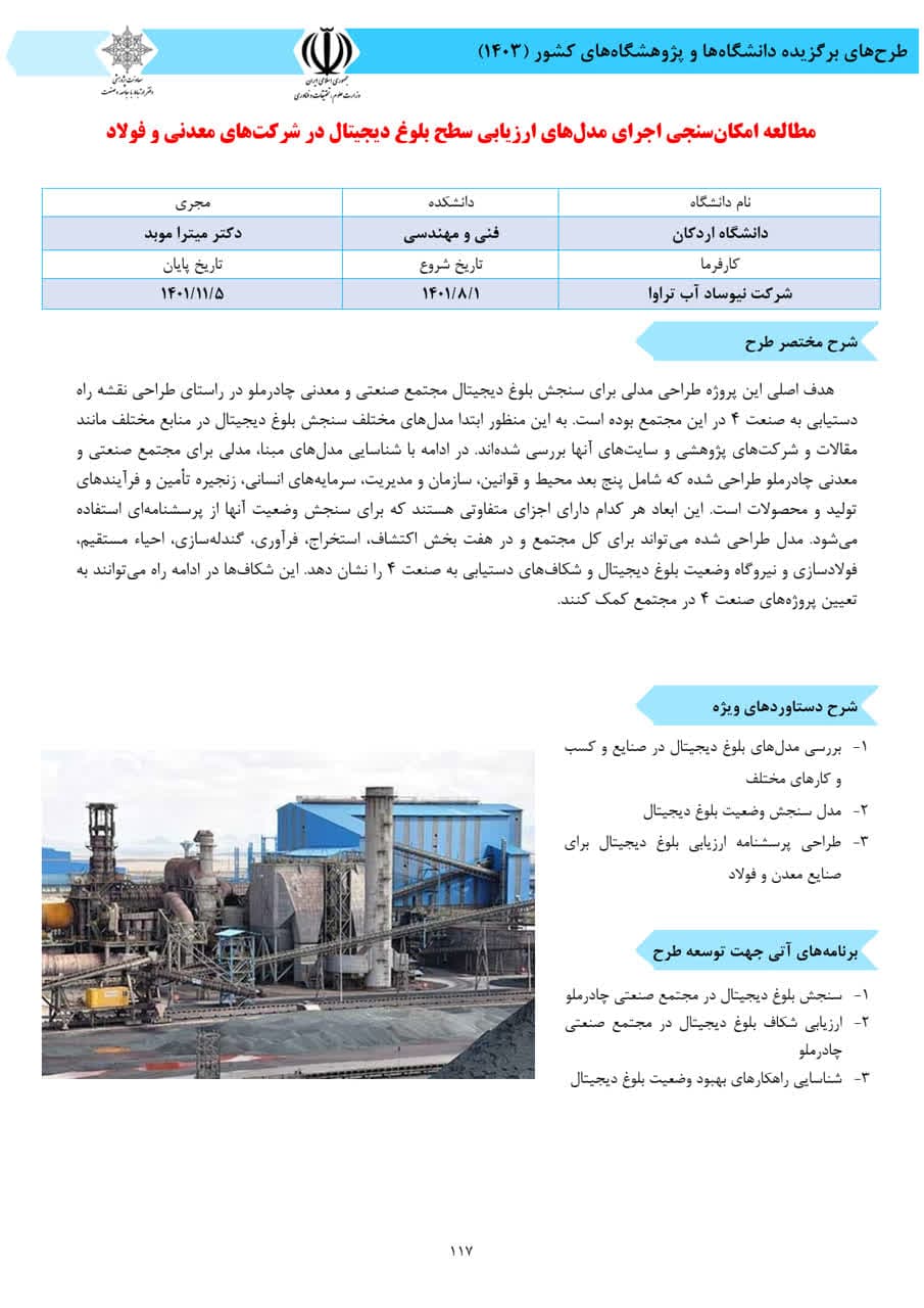 In this collection, two projects by Dr. Mitra Mobad titled “Feasibility Study on the Implementation of Digital Maturity Assessment Models in Mining and Steel Companies” and “Documentation of the Experiences of Business Clusters in Yazd Province,” as well as a joint project by Dr. Mina Alafzadeh and Dr. Mehran Rabani titled “The Effect of Insulation on Reducing Cooling Load in Buildings,” have been introduced as distinguished research projects.