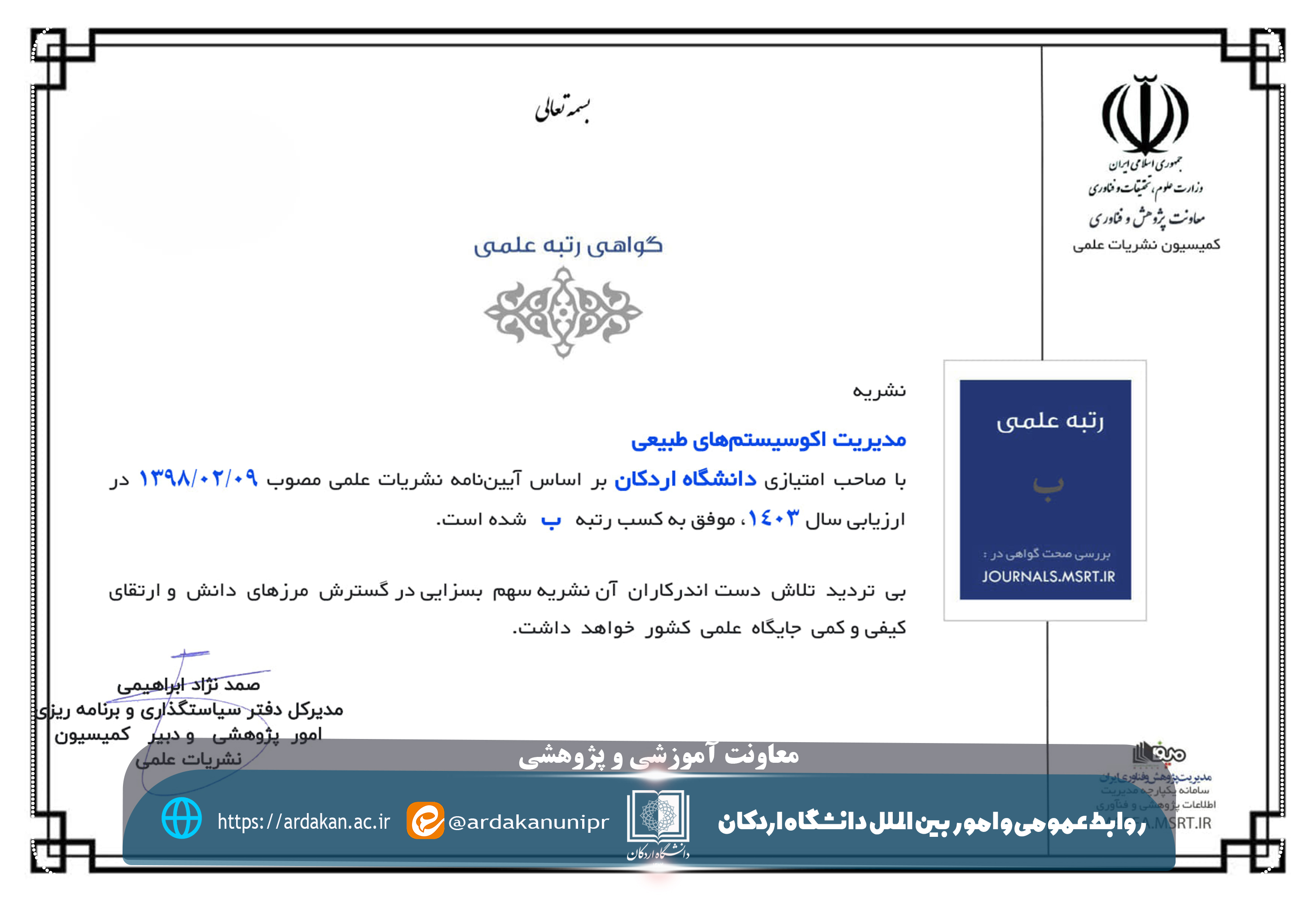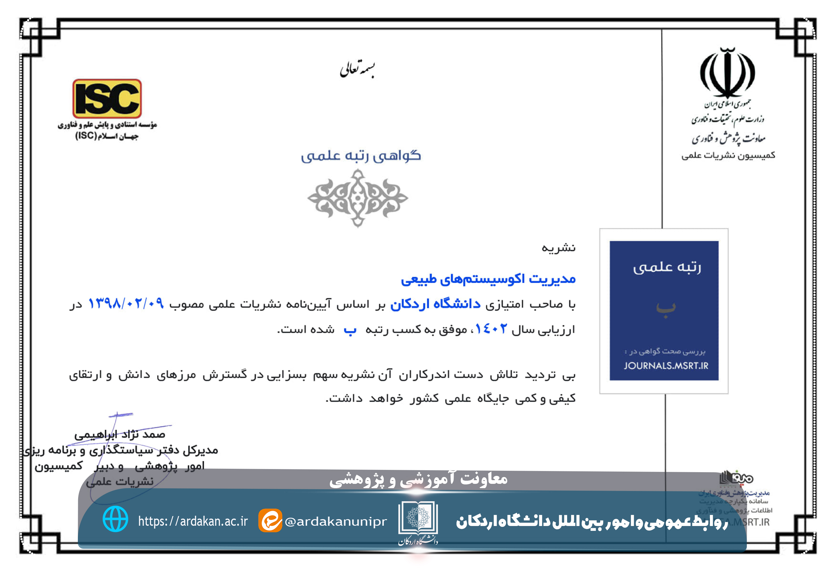 - اخذ مجوز نشریه علمی "مدیریت اکوسیستم‌های طبیعی" با رتبه "ب"